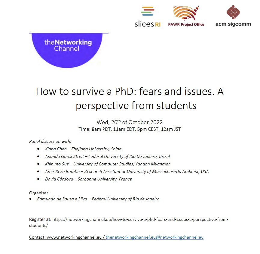 On Wednesday, October 26 at 12:00 pm, the Networking Channel will host the panel "How to Survive a Ph.D.: Fears and Issues. A Perspective from Students" key. A look from the students' point of view).