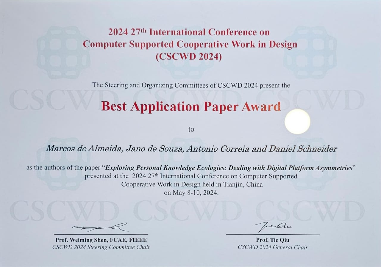The article "Exploring Personal Knowledge Ecologies: Dealing with Digital Platform Asymmetries" written by Marcos Antonio de Almeida (Posdoc PESC), his supervisor Jano Moreira de Souza (Coordinator of the Laboratory of the Future - PESC), António Correia (University of Jyväskylä) and Daniel Schneider (NCE/UFRJ and PPGI/UFRJ) received the "Best Application Paper Award" from the 2024 27th International Conference on Cooperative Work in Computer-Supported Design, held in Tianjin, China, May 8-10, 2024 .
