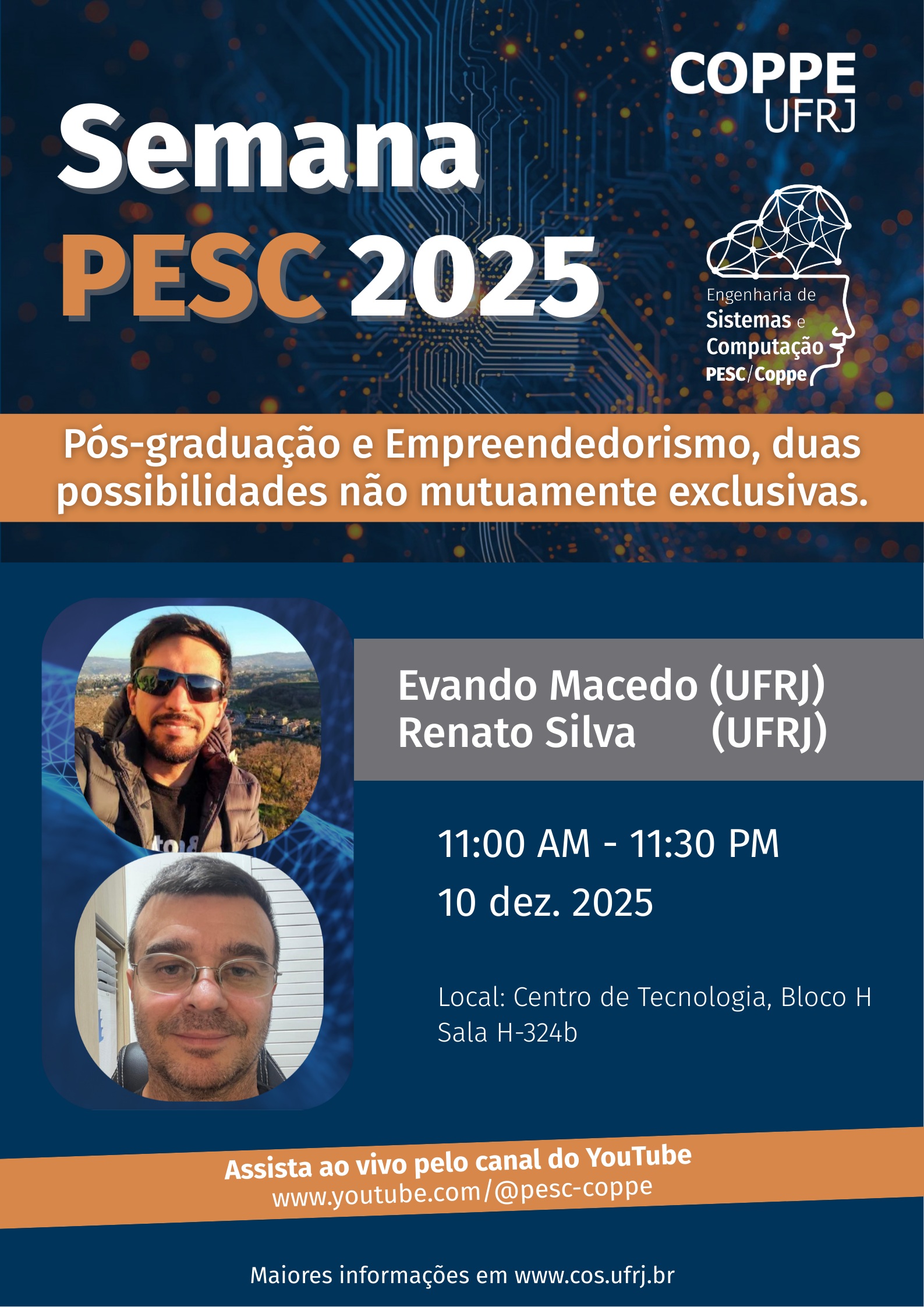 11:00 - Renato Souza Silva e Evandro Macedo (ex alunos do PESC) - Pós-graduação e Empreendedorismo: duas possibilidades não mutuamente exclusivas