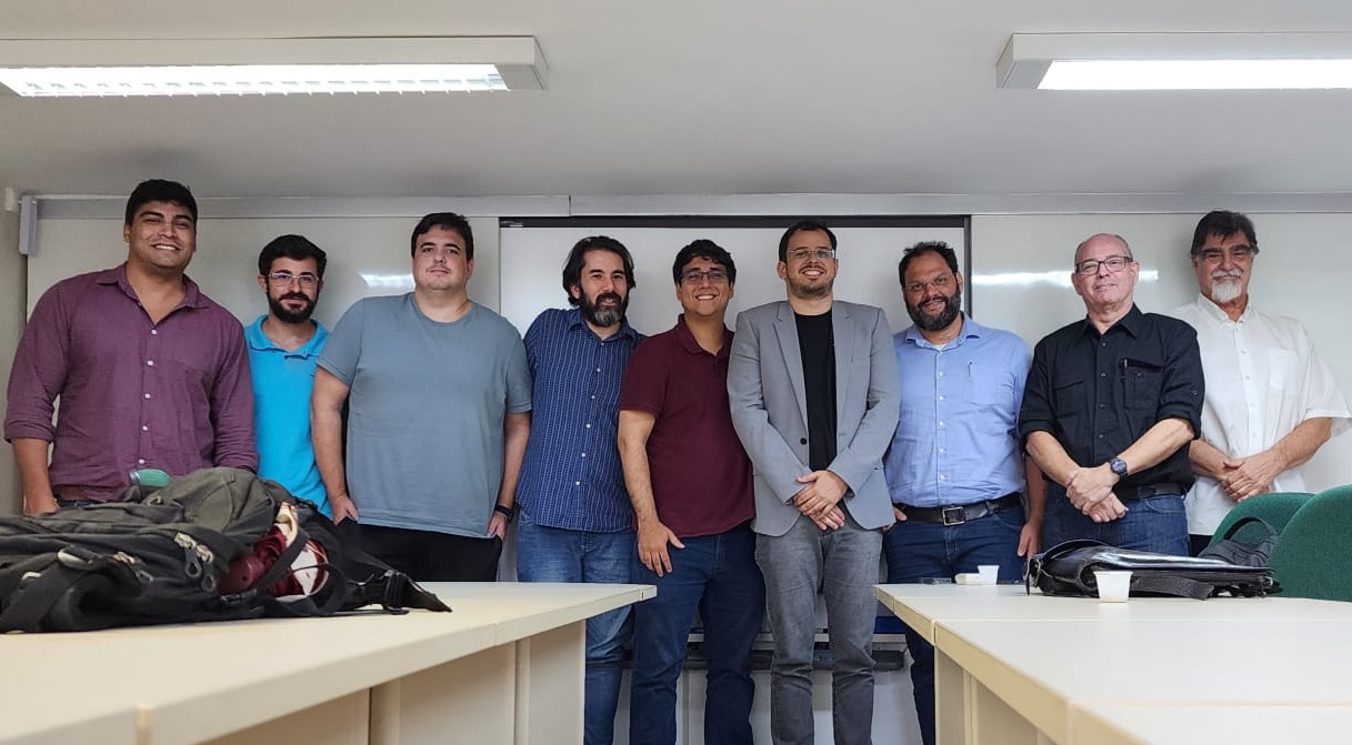Abaixo, na foto dos participantes da reunião, da esquerda para a direita: João Maués (mestrando PESC), Gabriel Gazola Milan (mestrando PESC), Diego Leonel Cadette Dutra (Prof. PESC), Claudio Miceli de Farias (Prof. PESC), Ewerton Figueirôa (Diretor Executivo Scinet), Rodrigo Lopes (Diretor Operações Netcon), Paulo Altomare (Consultor Instituto Scinet), Cristiano Ferraz (CTO Netcon Americas).
