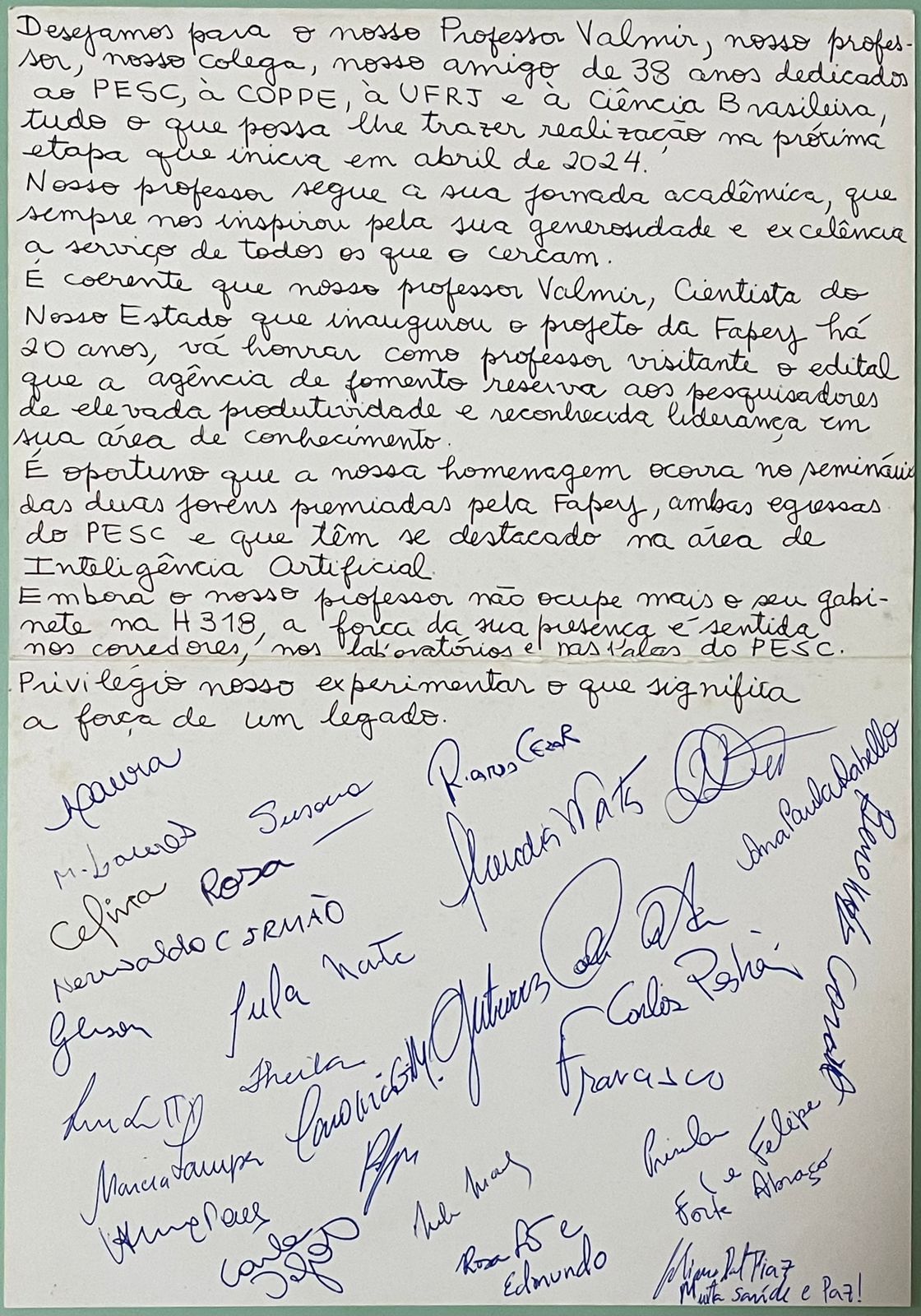 Hoje, ao final do Seminário PESC das Profas. Aline Paes (IC/UFF) e Carolina Marcelino (IC/UFRJ), a Professora Celina Miraglia (PESC) leu o cartão escrito, de improviso, como uma homenagem dos colegas ao Prof. Valmir. O cartão que foi assinado pelos presentes. Temos certeza de que haveria muitas outras assinaturas se o mesmo fosse passado entre quem conheceu o Prof. Valmir.