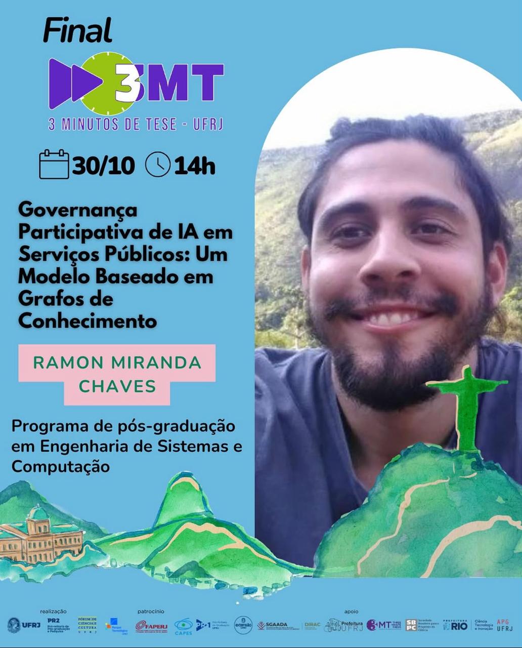 Entre os finalistas, na Área de 'Engenharias e Ciências Exatas e da Terra', está Ramon Miranda Chaves, doutorando do PESC/COPPE/UFRJ, com o trabalho “Governança Participativa de IA em Serviços Públicos: Um Modelo Baseado em Grafos de Conhecimento”, orientado pelo professor Jano de Souza.