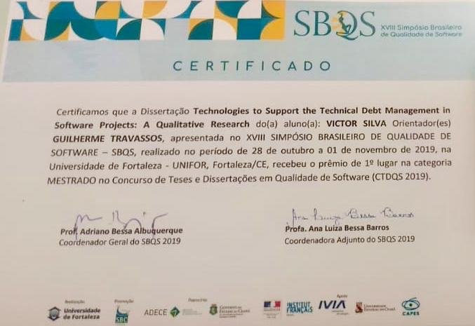 A dissertação "Technologies to Support the Technical Debt Management In Software Projects: A Qualitative Research" de Victor Machado da Silva (Mestre pelo PESC), orientado por Guilherme Horta Travassos, ganhou o prêmio de melhor dissertação de Mestrado no Concurso de Teses e Dissertações em Qualidade de Software (CTDQS 2019), durante o XVII Simpósio Brasileiro de Qualidade de Software - SBQS, realizado de 28 de outubro a 1 de novembro de 2019 em Fortaleza.