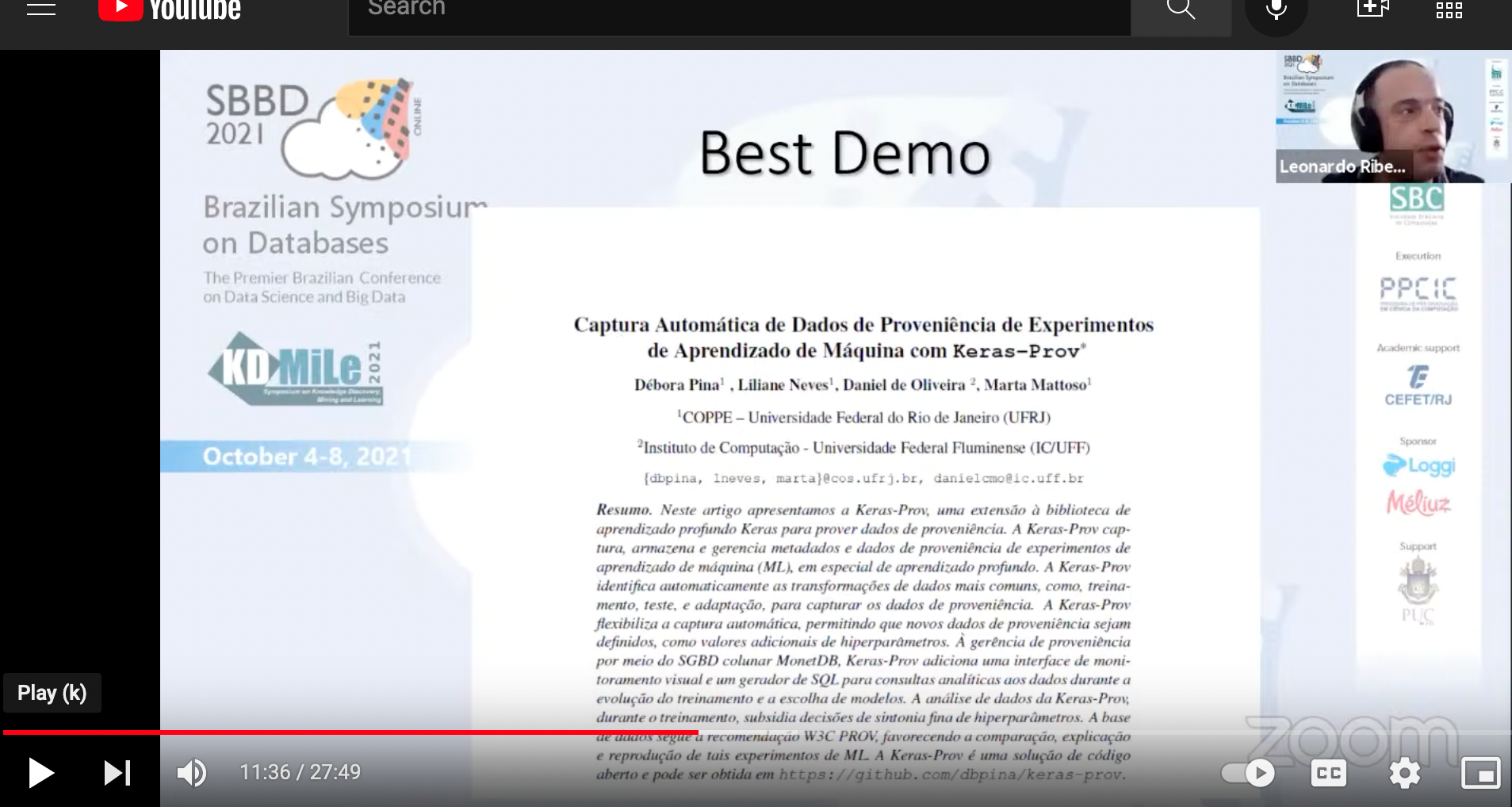 O software Keras-Prov e seu artigo "Captura Automática de Dados de Proveniência de Experimentos de Aprendizado de Máquina com Keras-Prov " de autoria de Débora Pina (Doutoranda no PESC), Liliane Neves Kunstmann (Doutoranda no PESC), Daniel de Oliveira (IC/UFF) e Marta Mattoso (PESC) recebeu o prêmio Best Demo, como a melhor demonstração de software do XXXVI Simpósio Brasileiro de Bancos de Dados (SBBD 2021).