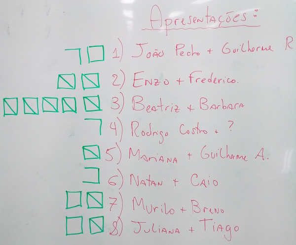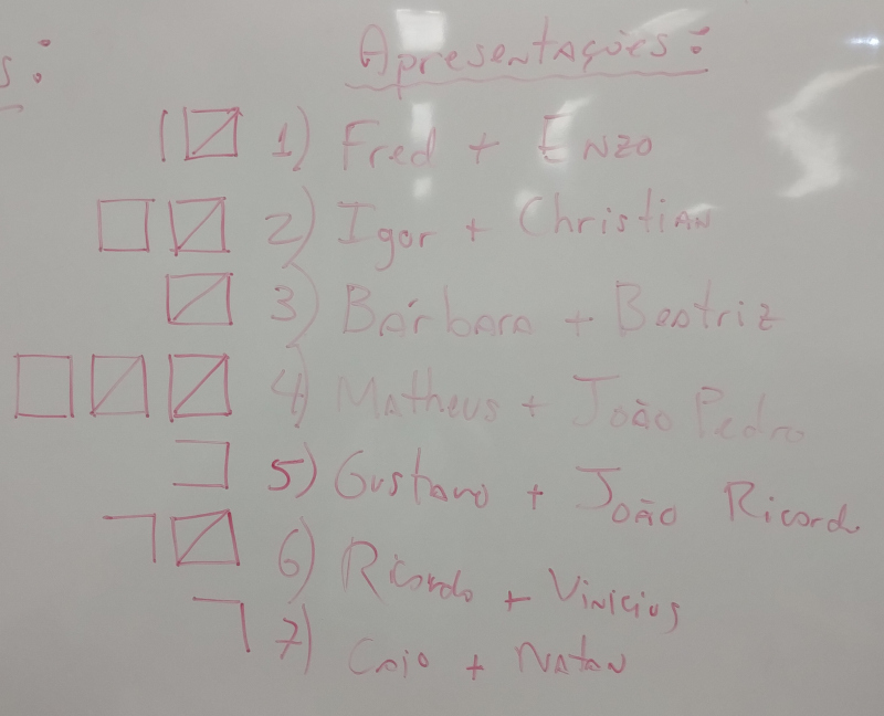 | 26 | 22/11 | Apresentação e discussão do TP 3. Iremos votar no melhor trabalho (ver resultado abaixo) | Entregar TP 3 | ||