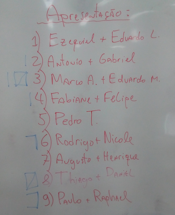 | 14 | 24/9 | Apresentação do TP1 (alunos com nome entre M e Z, considerando o menor nome da dupla). Iremos votar no melhor trabalho (ver resultado abaixo) | Entregar TP 1 | ||